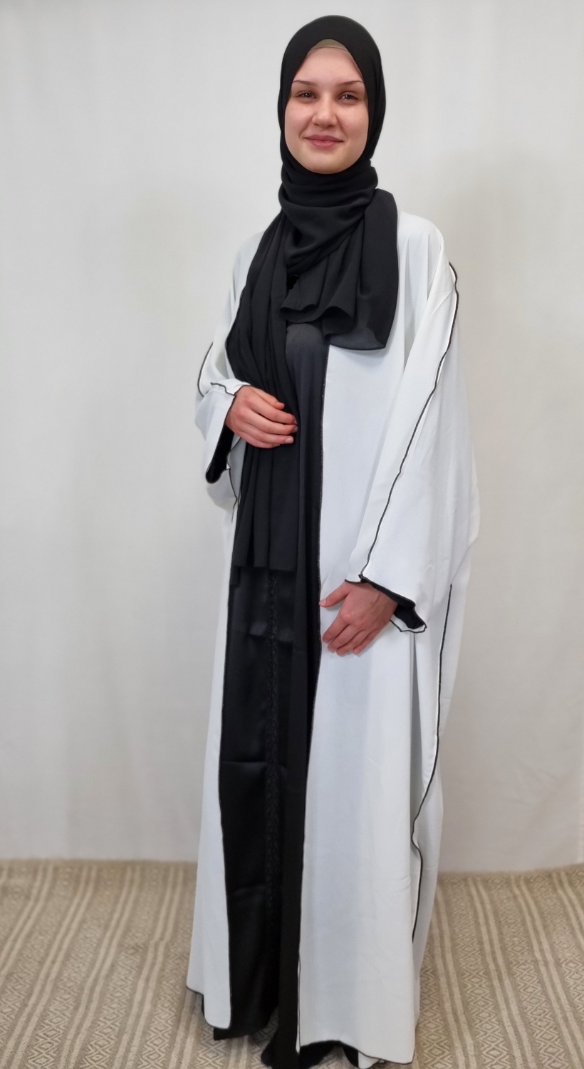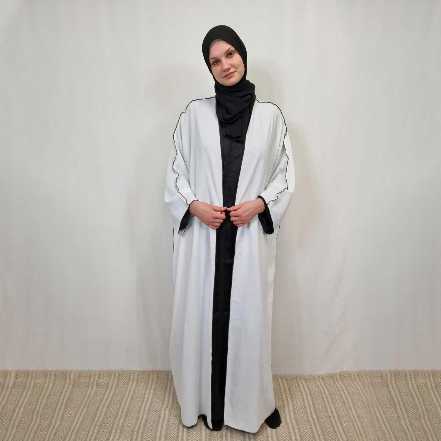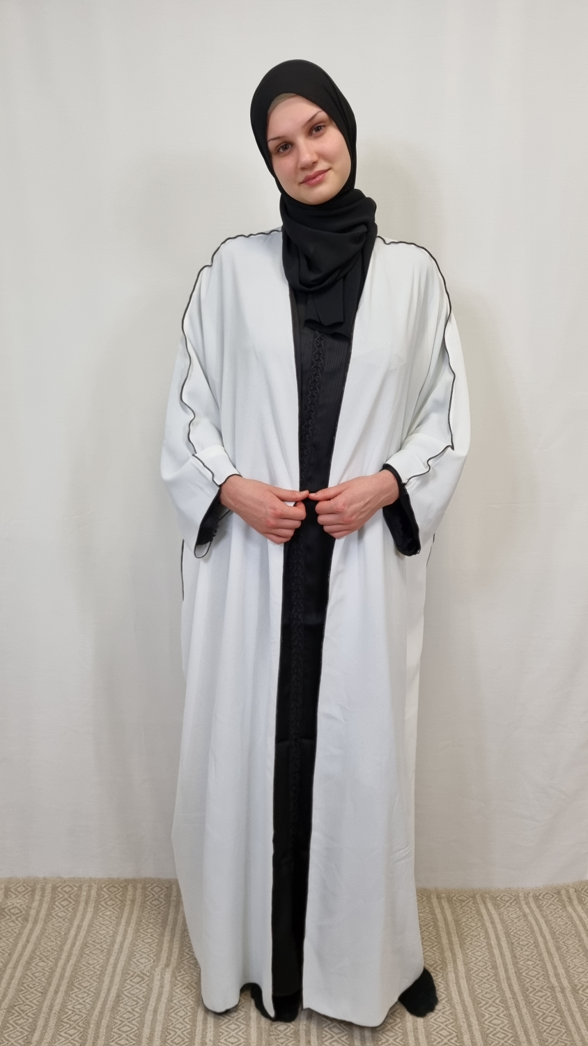 This simple open white abaya is both stylish and casual. On the side, it is adorned with a black detail that runs along the entire sleeve. The abaya come in one size. An addition that will elevate your outfit.
